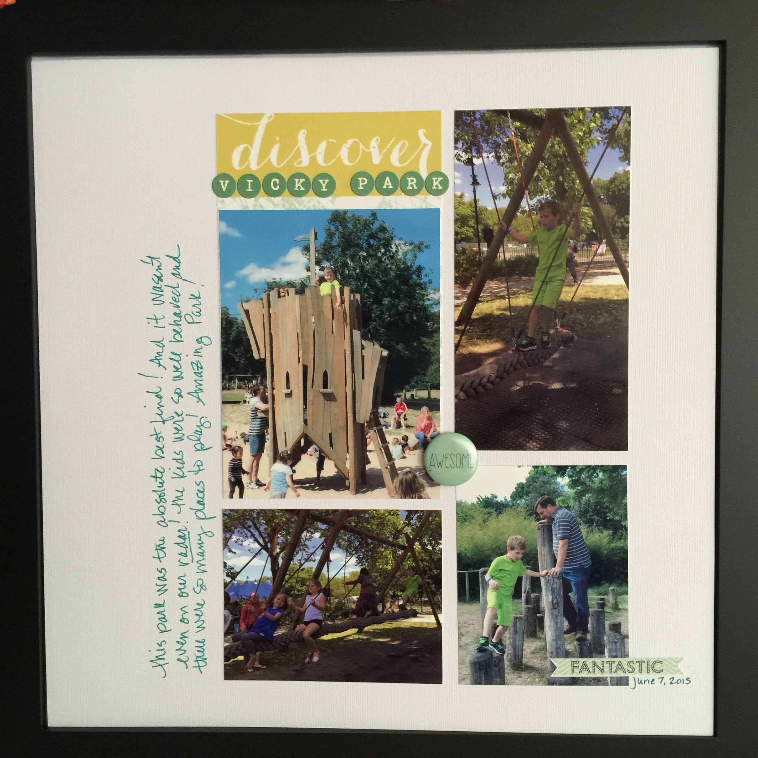 The album I’m creating is part Project Life, and part traditional LOs. I’ve been picking stories I want to tell, and then making those stories LOs. One of the best finds we made in London was Vicky Park. It is an incredible park! I really wanted to showcase the awesome ways that Sean played at the park. His favorite was a huge rope swing that looked like a snake. I swear 10 kids could ride on that swing! I’m still stash busting, and this was an Echo Park kit that I got at the LAST Scrapbook Expo! I used a single piece of flair, and a sticker, and bamn! I’m really loving the graphic nature of my scrapping lately.