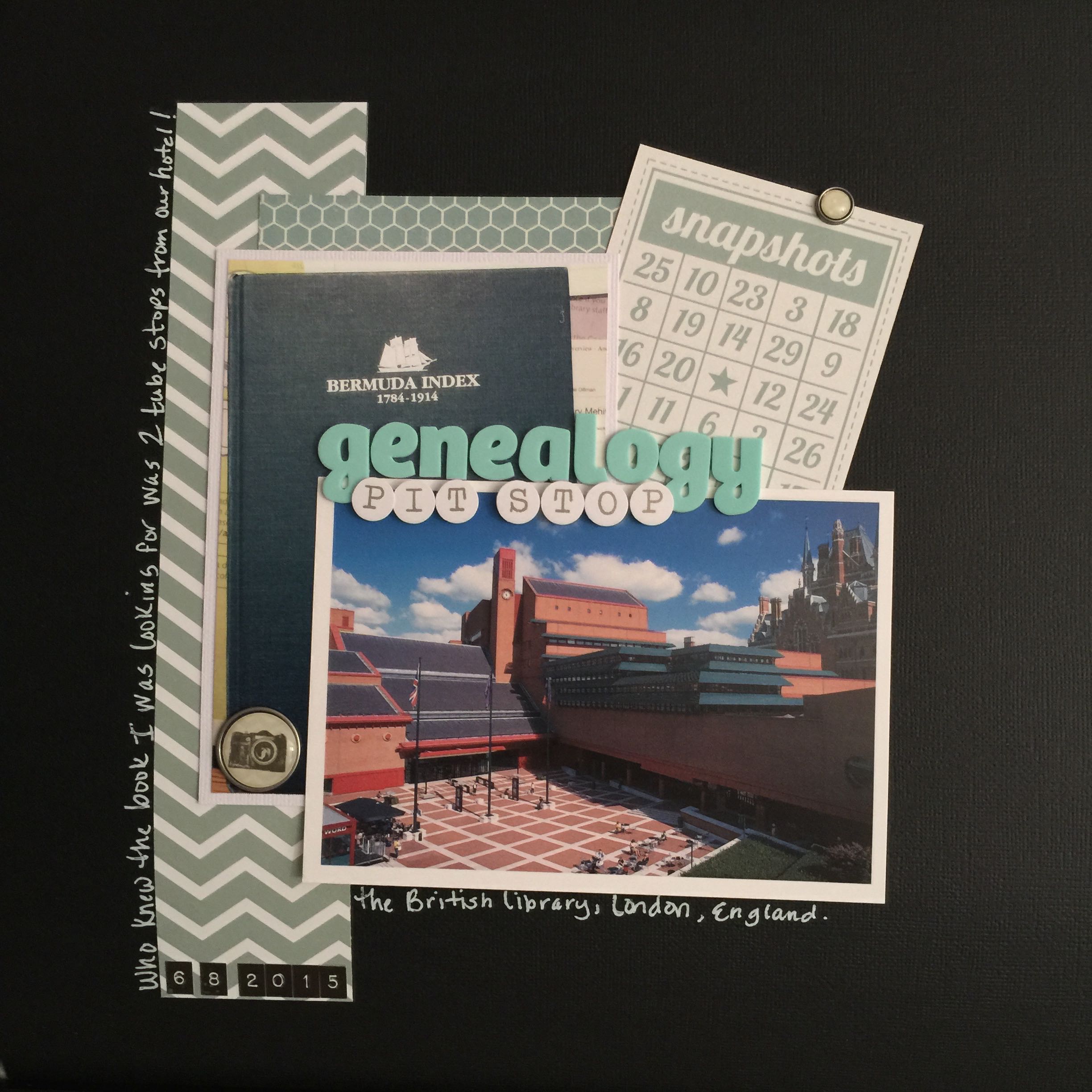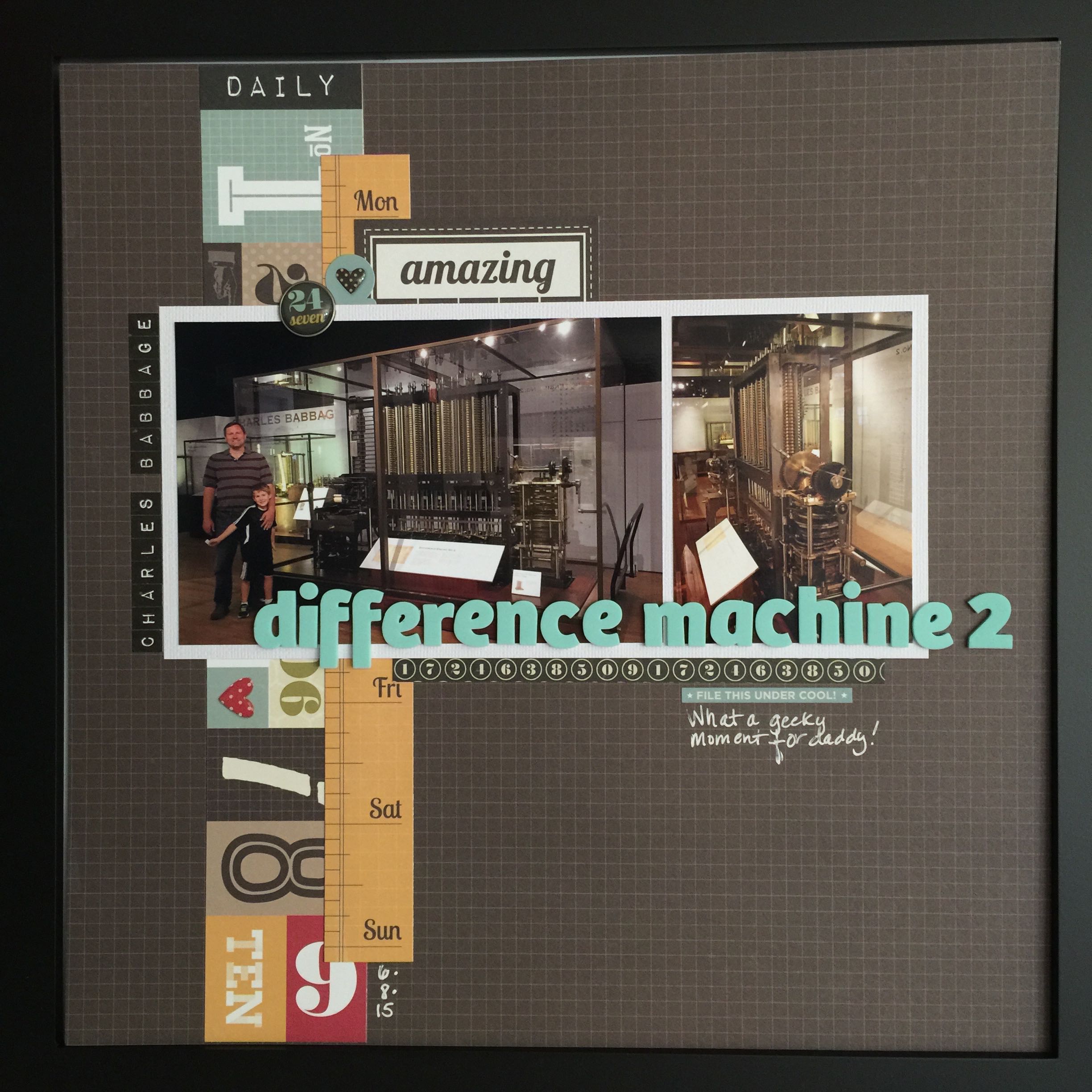 Finally, I cropped about one of the many geeky moments my husband had in England. This was a math geeky moment, at Charles Babbage’s Difference Machine 2. All I know is that is adds and subtracts numbers. And that it is accurate. And that another guy asked me to take his picture in front of the machine. He was having a geeky moment as well. Again Simple Stories helped me out with lots of numbers in the 24/7 line. I love how it turned out. And while it is similar to the genealogy pit stop, it does have differences, and my husband loves it.